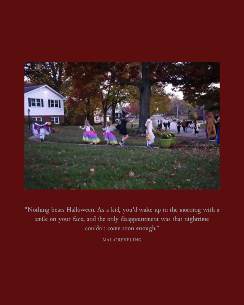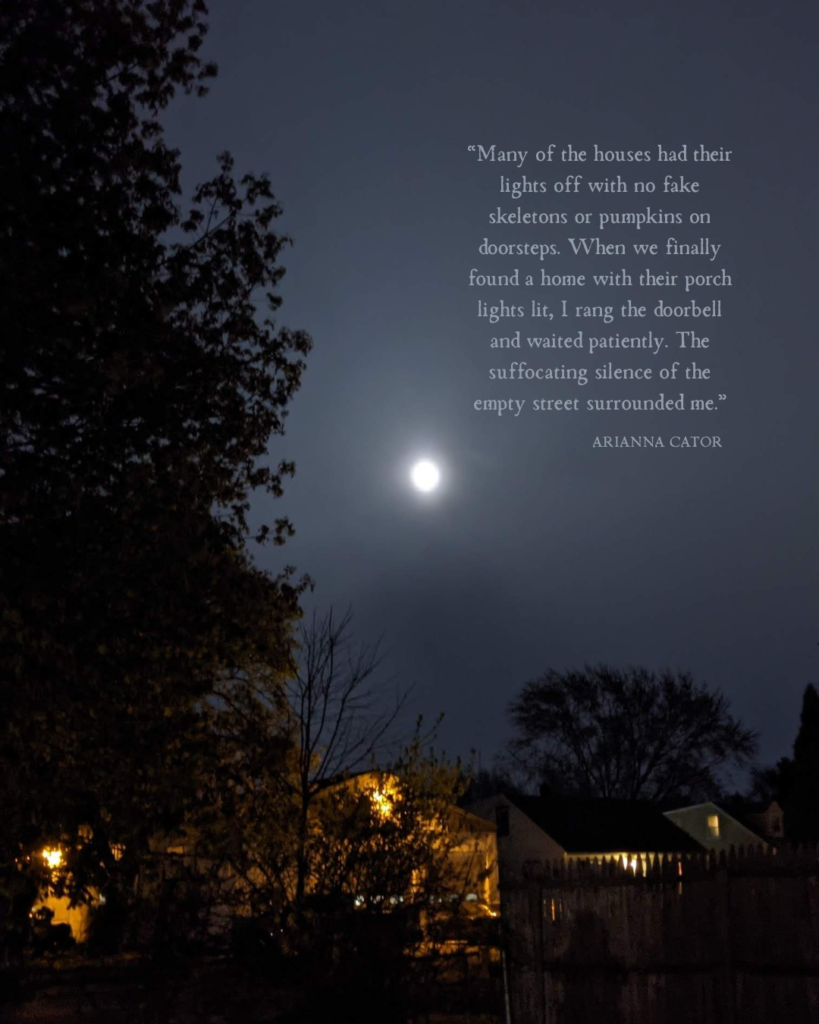 lights off with no fake skeletons or pumpkins on doorsteps. When we finally found a home with their porch lights lit, I rang the doorbell and waited patiently. The suffocating silence of the empty street surrounded me. An elderly couple opened the door, arms outstretched with a plastic pumpkin full of candy. I was invited to take as many as I wanted as their scruffy Bichon Frise nipped at the hem of my dress. The warmth from their home spilled onto the doorstep, filling my nose with apple cinnamon. The walk back home felt long. An endless expanse of grey pavement lay in front of us.