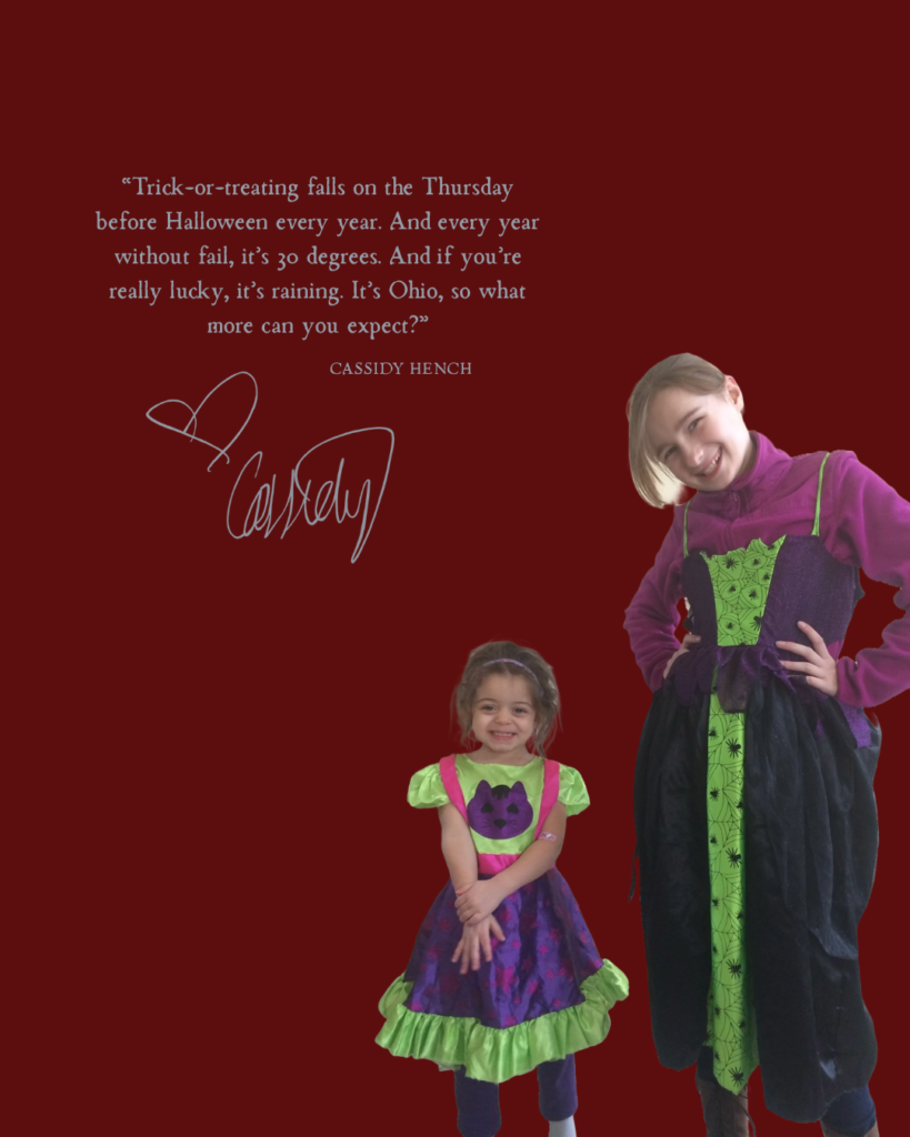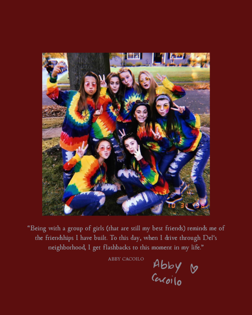 In sixth grade, my friend group and I dressed up as hippies—AKA wore tie-dye and circle glasses. We trick-or-treated in my friend, Del’s, neighborhood. I remember the streets being filled with parents and kids running around. This memory has always resonated with me when I think of the fall. Being with a group of girls (that are still my best friends) reminds me of the friendships I have built. To this day when I drive through Del’s neighborhood, I get flashbacks to this moment in my life.