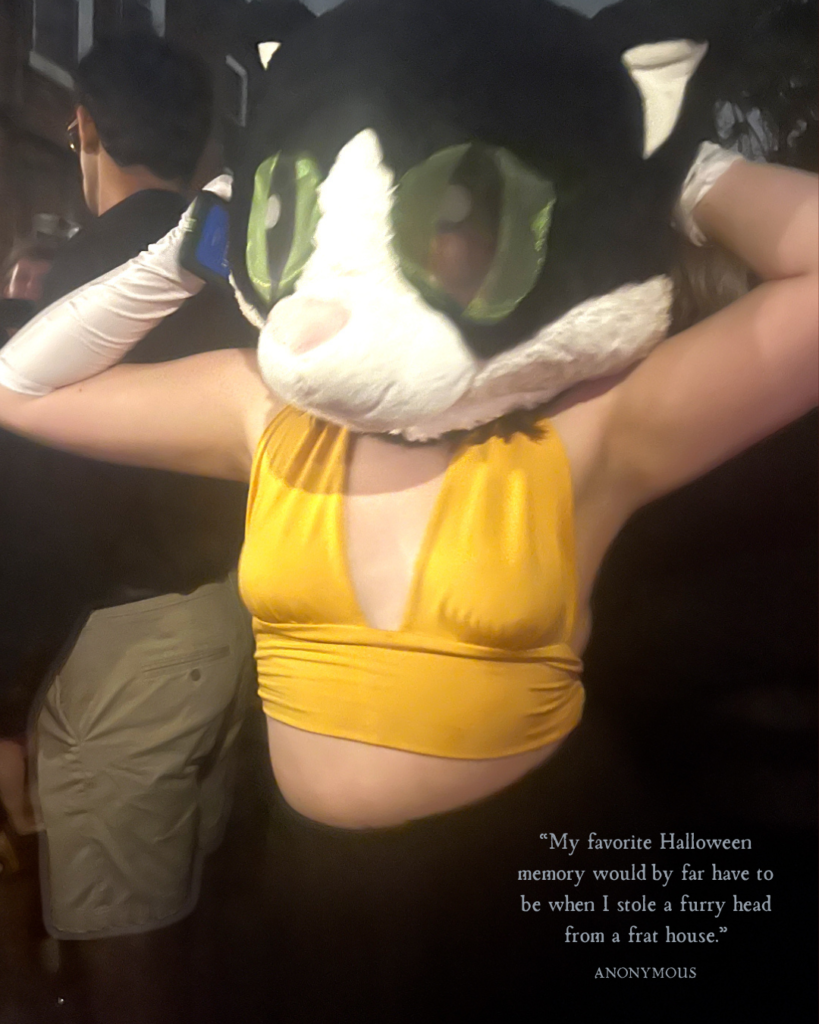 My favorite Halloween memory would by far have to be when I stole a furry head from a frat house. Freshman year of college, I was at a Halloween party with a large group of my friends. The party was split between two backyards with a fence dividing them. We made it to the original party but heard a rumor that there was a bathroom in the other house. I hopped the fence with my friend Luke in an attempt to use the bathroom. We got inside and walked down the hallway, but two guys were blocking the door. They let me use the bathroom just fine, but not my friend Luke—simply because he is a guy. They told him to “whip it out” outside, and I was fed up. On our way out, there was a furry head sitting on the kitchen counter and I grabbed it, ran, and then hopped the fence. I then flaunted my prize to the other party and walked away unscathed. Even up to this day, my friends and I sporadically put the infamous furry head on.